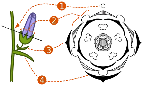 A linha tracejada mostra a secção transversal. 1 – posição do eixo principal; 2 – secção transversal através da flor; 3 – bracteola; 4 – bráctea inferior.