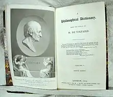 Dictionnaire philosophique (Dicionário filosófico) é um dicionário enciclopédico publicado por Voltaire em 1764. Os artigos classificados alfabeticamente criticam frequentemente a Igreja Católica Romana, o Judaísmo, o Islã e outras instituições. A primeira edição, lançada em junho de 1764, passou pelo nome de Dictionnaire philosophique portatif. Eram 344 páginas e 73 artigos. As versões posteriores foram expandidas em dois volumes consistindo de 120 artigos.[1] As primeiras edições foram publicadas anonimamente em Genebra por Gabriel Grasset. Devido ao conteúdo volátil do Dictionnaire, Voltaire escolheu Grasset em relação a sua editora habitual para garantir seu próprio anonimato. Houve muitas edições e reimpressões do Dictionnaire durante a vida de Voltaire, mas apenas quatro delas continham adições e modificações.[2] Além disso, outro trabalho publicado em 1770, Questions on l'Encyclopédie, que continha artigos remodelados e modificados da Encyclopédie sempre em ordem alfabética, levou muitos editores seguintes a se juntar a esta e ao Dictionnaire (além de outras obras menores) em uma composição única.[3] O Dictionnaire era um projeto de vida para Voltaire. Representa o ponto culminante de suas opiniões sobre o cristianismo, Deus, a moral e outros temas.