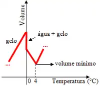 Quando a água é aquecida de 0°C a 4°C, as ponte de hidrogênio rompem-se e as moléculas passam a ocupar os vazios existentes, provocando, assim, uma contração. Portanto, no intervalo de 0°C a 4°C, ocorre, excepcionalmente, uma diminuição de volume.