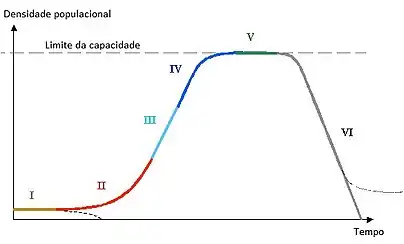 Para amostrar o desenvolvimento das populações, foi desenvolvido um modelo com seis fases. Em uma população real, normalmente não ocorrem todas as fases. A população pode já morrer na fase 1, ou então se perpetuar para além da fase 6, e não morrer nesta, como mostrado no gráfico.