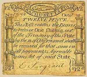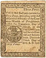 Uma por uma, as colônias começaram a imprimir papel moeda como um conveniente meio de troca. Em 1690, a Província da Baía de Massachusetts criou o "primeiro dinheiro em papel com impressão autorizada por um governo do Ocidente" [5]. Foram usados para o pagamento da expedição militar durante a Guerra do Rei William. Outras colônias seguiram o exemplo e lançaram mão da emissão de dinheiro em papel para custearem conflitos militares subsequentes[5].