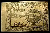 Durante a Revolução Americana, as colônias se tornaram Estados independentes. Livres da regulação britânica, elas passaram a emitir papel moeda para pagarem gastos militares. O Congresso Continental também imprimiu dinheiro durante a Revolução, que ficou conhecido como "dinheiro continental" (Continental currency). Em 1777, foram autorizadas 42 formas diferentes de moedas continentais [2]. As notas se desvalorizaram rapidamente, piorando a situação ao término da Guerra.