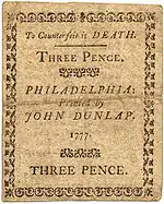 Após o começo da Guerra da Independência em 1775, o Congresso Continental iniciou a impressão de notas conhecidas como dinheiro continental ou "continentais" (Continentals). As notas continentais eram em dólares e iam de 1/6 de dólar a 80 dólares, incluindo muitas variações. Durante a Revolução, o Congresso imprimiu 241.552.780 em Dinheiro Continental [10].