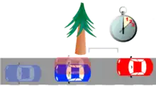 ![]() A regra dos dois segundos diz ao motorista defensivo a distância mínima para evitar colisões em condições ideais de direção. O motorista do carro vermelho escolhe uma árvore para avaliar um atraso de segurança de dois segundos. | |
