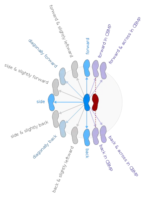 - para a frente em CBMP (ou seja, o pé em movimento é colocado diretamente na frente do pé de apoio),