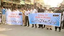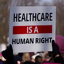 Uma forma alternativa de conceituar superficialmente o direito à saúde é "direito humano aos cuidados de saúde ". Notavelmente, isso abrange os direitos do paciente e do provedor na prestação de serviços de saúde.[6] Os direitos do paciente na prestação de cuidados de saúde incluem: o direito à privacidade, informação, vida e cuidados de qualidade, bem como isenção de discriminação, tortura e tratamento cruel, desumano ou degradante.[6][7]