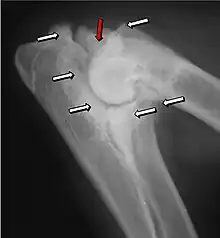 Na osteocondrite dissecante, o período normal de mudança de cartilagem para ósso no desenvolvimento da articulação falha ou está atrasada. A cartilagem continua a crescer e pode partir-se ou tornar-se necrótica. A causa é incerta, mas, possivelmente, inclui a genética, traumas e nutrição (incluindo o excesso de cálcio e diminuição da Vitamina C).[4] As lesões por osteocondrite dissecante são encontradas no cotovelo no epicôndilo medial do úmero. Condições específicas relativas à osteocondrite dissecante incluem a fragmentação do processo medial coronoid process da ulna e um ununited anconeal process da ulna. Todos os tipos de osteocondrite dissecante do cotovelo são geralmente encontrados em cães de raças grandes, com sintomas à partir dentre as idades de 4 a 8 meses. Os machos são afetados duas vezes mais frequentemente que as fêmeas. A doença geralmente afeta ambos os cotovelos (30 a 70% das vezes), e os sintomas incluem claudicação intermitente, inchaço das articulações, e rotação externa e abdução da pata.[5] Osteoartrite irá se desenvolver mais tarde na maioria dos casos.