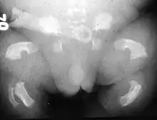 - Acondrogénese: os fémures não apresentam curvatura e as margens metafisárias são irregulares, o tórax não é tão estreito, verifica-se um atraso extremo na ossificação sobretudo nos corpos vertebrais, ísquion, púbis, sacro, calcâneos e talus.[22]