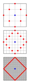 Uma circunferência de raio r para a distância de Chebyshev (métrica L∞) sobre o plano é também um quadrado com lados medindo 2r, paralelos aos eixos coordenados, então a distância de Chebyshev planar pode ser vista como equivalente por rotação e escalamento à distância do táxi planar. No entanto, esta equivalência entre as métricas L1 e L∞ não se generaliza para dimensões maiores.