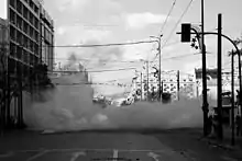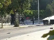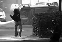![]() Em sentido horário do topo esquerdo; tropa de choque encara manifestantes, tropa de choque se move para conter civis insurrectos, um manifestante insurrecto, vans incendiadas, uma barricada incendiada, manifestantes se afastando de Gás lacrimogêneo | |