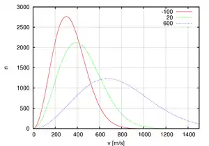 Assim, a velocidade média das moléculas a uma certa temperatura é dada por , a velocidade mais provável de ser encontrada é dada por e a velocidade quadrática média é dada por .[1] Dessa forma, é possível esboçar um gráfico semelhante ao da imagem ao lado, no qual fica mais fácil de visualizar a distribuição.