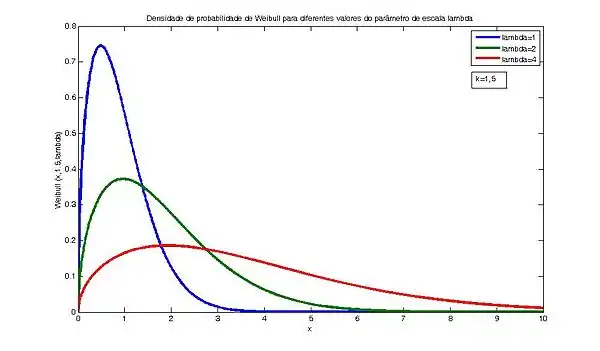 para e f(x; k, λ, θ) = 0 parax < θ, onde é o parâmetro de forma, é o parâmetro de escala e o parâmetro de localidade da distribuição. Quando θ=0, temos o caso da distribuição de Weibull com apenas 2 parâmetros apresentado na definição.