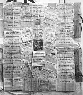 Entre 1843 e 1910, mais de 5 milhões de alemães emigraram para o exterior,[42] principalmente para os Estados Unidos.[43] O alemão permaneceu uma língua importante em igrejas, escolas, jornais e até mesmo na administração da Associação de Cervejeiros dos Estados Unidos[44] até ao início do século XX, mas foi severamente reprimido durante a Primeira Guerra Mundial. Ao longo do século XX muitos dos descendentes de imigrantes dos séculos XVIII e XIX deixaram de falar alemão em casa, mas pequenas populações de falantes ainda são encontrados na Pensilvânia (Amish, Hutterites, Dunkards e alguns menonitas historicamente falaram alemão hutterita e uma variedade de alemão centro-oeste alemã conhecida como Pensilvânia Alemão ou holandês da Pensilvânia), Kansas (menonitas e alemães do Volga), Dakota do Norte (alemães hutterites, menonitas, alemães russos, alemães do Volga e alemães bálticos), Dakota do Sul, Montana, Texas (Texas German), Wisconsin, Indiana, Oregon, Oklahoma e Ohio (72.570).[45]