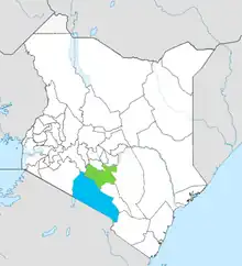Condado de Kajiado (azul) próximo ao Metrô de Nairóbi (verde)