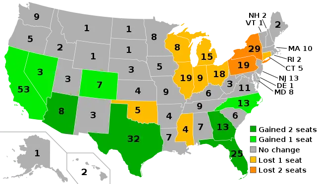 De acordo com o censo de 2000, cada distrito possui em média 646.946 habitantes, a Califórnia é o estado com o maior número de distritos, 53 no total. Estados com baixa população como Alaska, Delaware, Montana, Dakota do Norte, Dakota do Sul, Vermont e Wyoming possuem apenas um distrito.