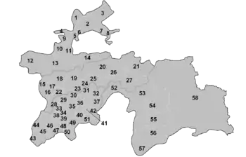 As províncias do Tajiquistão são subdivididas em 58 distritos (em tajique: ноҳия, nohiya; em russo: Zona, rayon), não incluindo os 4 distritos pertencentes à capital, Duchambé, juntamente com 17 cidades de subordinação provincial (incluindo Dushanbe, uma cidade capital extraprovincial).[1][2][3]