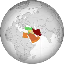 Arábia Saudita - Barém - Chipre - Emirados Árabes Unidos - Iémen - Irão - Iraque - Israel - Jordânia - Kuwait - Líbano - Omã - Palestina - Qatar - Síria - Turquia