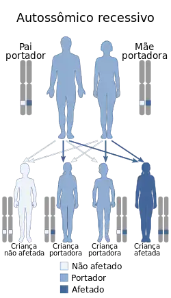Uma doença autossômica recessiva é caracterizada por atingir homens e mulheres na mesma proporção e induzida pelo gene recessivo originado do cruzamento dos pais do indivíduo. A doença só se manifesta se existir 2 alelos recessivos.