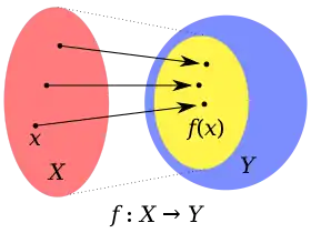 A imagem (às vezes chamada de intervalo) de é o conjunto de todos os valores assumidos por para todos os possíveis ; este é o conjunto . A imagem de pode ser o mesmo conjunto que o contradomínio ou pode ser um subconjunto próprio dele. É, em geral, menor que o contradomínio; é o contradomínio inteiro se e somente se é uma função sobrejetiva.