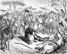 Cansou-se o moço e os mercadores foram-se embora deixando o pobre Dom Quixote desancado, e quando se viu só tentou levantar-se, e mesmo assim se dizia com sorte pois aquela desgraça era própria dos cavaleiros andantes atribuindo o mal sucedido à falha do seu cavalo.[3]:78