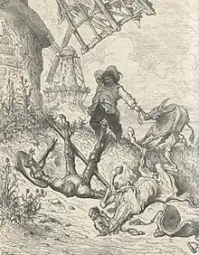 E dizendo isto, deu esporas no Rocinante e investiu contra o primeiro moinho que estava diante dele; e dando uma lançada na aspa, moveu-a o vento com tanta força que partiu a lança em pedaços levando atrás dela o cavalo e o cavaleiro que foi rolando muito maltratado pelo chão.[3]:105:106