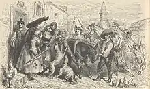 Tendo os dois passado a noite entre umas árvores, quando no outro dia viajavam, aproximaram-se de dois frades beneditinos que vinham montados em mulas e traziam óculos de jornada e guarda-sóis de sela. Atrás destes, mas não sendo do mesmo grupo, vinha um coche guardado por quatro ou cinco homens a cavalo e ainda dois moços de mulas a pé. Vinha no coche uma dama da Biscaia que ia a Sevilha onde estava o marido que iria partir para as Américas.[3]:108:109