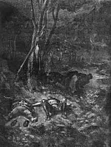 Então o Cavaleiro da Serra pediu que lhe dessem qualquer coisa de comer e que depois contaria a sua história. Acabada a comida, o Cavaleiro do Bosque levou-os a um verde prado, estendeu-se no chão por cima da erva, no que foi imitado pelos outros, e então começou a sua história, avisando para não o interromperem de maneira alguma, caso contrário no mesmo instante findaria a narrativa.[8]:31:32