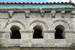 No Exterior, em cima das arcadas que percorrem o edifício podem-se observar nas cornijas 64 cachorros de decoração fitomórfica, antropomórfica, zoomórfica e geométrica.