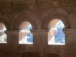 Já no interior podemos observar que as paredes também terminam em cornija que por sua vez assenta em 53 cachorros. Ainda mais, alguns arcos apresentam uma decoração com "X" que percorre o vão inteiro.[1][5]