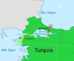 No final da Segunda Guerra Mundial, a Turquia foi pressionada pelo governo soviético a permitir que os navios russos navegassem livremente pelos estreitos turcos, que ligam o Mar Negro ao Mediterrâneo. Como o governo turco não se submeteu aos pedidos da União Soviética, surgiram tensões na região, levando a uma demonstração de força naval do lado dos soviéticos. Desde que a assistência britânica à Turquia terminou em 1947, os EUA enviaram ajuda militar para garantir que a Turquia mantivesse o controle principal da passagem. A Turquia recebeu US$ 100 milhões em ajuda econômica e militar e ainda enviaram o porta-aviões Franklin D. Roosevelt. O período pós-guerra de 1946 começou com um "período multipartidário" e o governo do Partido Democrata turco de Adnan Menderes.[1]