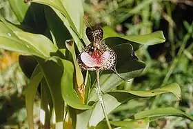 Pode ser diferenciada das espécies mais próximas por apresentar sépalas maculadas de marrom escuro curvadas para trás recobertas de verrugas pretas, e pelo grande labelo rosado que lembra um cogumelo rugoso sobre o qual aparecem estruturas avermelhadas.[2]