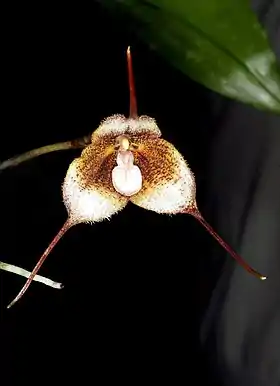 Supostamente é um híbrido de Dracula houtteana ou Dracula psittacina que apareceu espontaneamente em estufas de orquidófilos colombianos.[2]