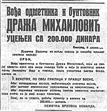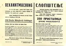 Proclamação alemã de 1942 e oferta de recompensa para Mihailović, após o assassinato de quatro oficiais alemães em Chetnik