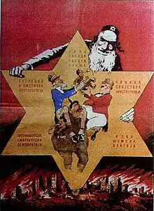 Draža Mihailović como um pequeno animal de estimação nas mãos dos Estados Unidos, Reino Unido e União Soviética, supostamente controlados pelos judeus, como parte da teoria da conspiração judaico-maçônica, retratada em um pôster da Grande Exposição Antimaçôica