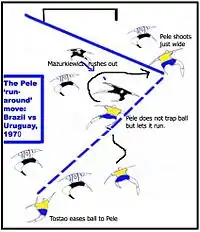 Na semifinal da Copa de 1970, contra o Uruguai, Pelé recebeu um lançamento de Tostão e sem tocar na bola, passou pelo goleiro Mazurkiewicz, enganando-o apenas na corrida em direção ao gol. Ele deixou a bola passar por um lado do goleiro, pegou do outro lado e chutou cruzado. Como estava sem ângulo, a bola foi pra fora.[4]