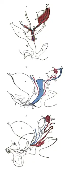 Tanto em machos quanto em fêmas, o ducto de Wolff desenvolve-se no trígono da bexiga, uma parte da parede da bexiga. Contudo, o desenvolvimento seguinte faz parte da diferenciação sexual do sistema reprodutor e do sistema urinário.