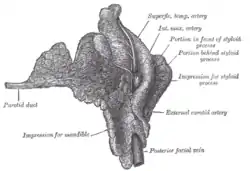 ![]() Dissecção mostrando as glândulas salivares no lado direito. (O ducto parotídeo está visível no centro.) | |