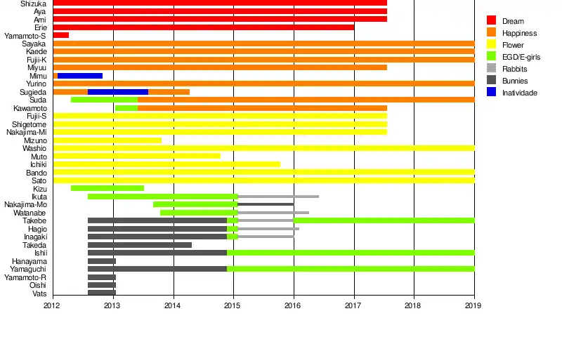 - Rio Inagaki, Momoka Nakajima, Misato Hagio, Marina Watanabe e Risa Ikuta foram removidas do E-girls pela LDH em 2016 e transferidas para o então grupo a estrear, Rabbits, a fim de receber treinamento adicional, apenas Yuzuna Takebe foi reintegrada ao E-girls.