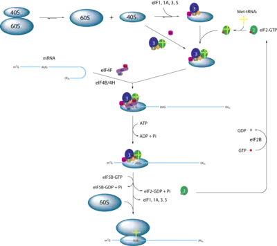 O processo de iniciação da tradução da tradução em eucariotos com eIF2 mostrado em verde claro. Outros fatores também são mostrados.
