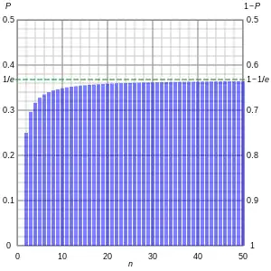 Quando n tende a infinito, pn se aproxima de 1/e. Além disso, o número de maneiras que os chapéus podem ser colocados as caixas de forma que nenhum fique na caixa correta é de n!/e arredondado ao inteiro mais próximo, para todo n positivo.[31]
