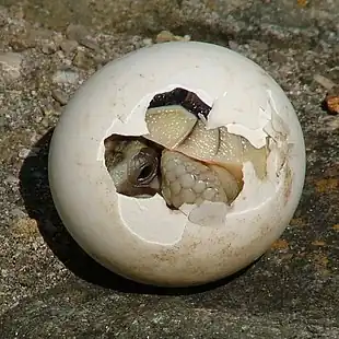 Eclosão de uma tartaruga, mostrando a saída do ovo.