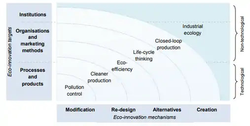 Ecoinovação é a produção, assimilação ou exploração de um produto, processo de produção, serviço ou método de gestão - que é novo para a organização e que resulta, ao longo do seu ciclo de vida, nas reduções do risco ambiental, da poluição e de outros impactos negativos no uso dos recursos (incluindo energia) - quando comparado a alternativas relevantes[1].