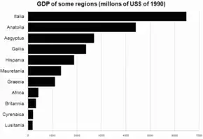 Todos os historiadores económicos frisam que qualquer estimativa só pode ser vista como uma aproximação grosseira das realidades da economia antiga, devido aos dados pertinentes que chegaram até nós serem muito escassos. O único economista citado que apresenta uma análise detalhada do rendimento nacional disponível (NDI)[nt 7] das diversas partes do Império Romano é Angus Maddison. As suas estimativas "altamente provisórias" apresentadas no quadro anexo baseiam-se numa contagem conservadora de apenas 44 milhões de habitantes na altura da morte de Augusto, em 14 d.C. O NDI da parte europeia do império era superior ao das províncias africanas e asiáticas se Itália for contabilizada, mas inferior no caso contrário.[80] As províncias helénicas (onde se falava sobretudo grego) — Grécia, Ásia Menor, Síria e Egito era aproximadamente 20% mais ricas do que a maior parte das províncias onde se falava mais latim, mas mais uma vez Itália, que não era administrada como uma província, desfrutava de um rendimento per capita mais alto do que quaisquer outras partes do império.[81]
