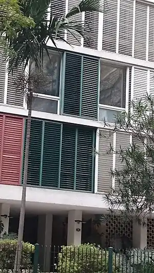 As janelas são revestidas com lâminas de ferro que quebram o sol. Foram pintadas em cores intercaladas em verde, vermelho, bege e branco. É um exemplar emblemático da arquitetura moderna brasileira. Nesta edificação, os vãos estruturais são fechados por venezianas de correr, que além de proteger, são decorativas, formando um mosaico que dá vida e movimento à fachada, fazendo a fachada mudar conforme ela se abre, possibilitando um melhor controle da luz.[3] Tem 15 andares, 60 apartamentos, 4 por andar, 180 metros quadrados cada um, com 3 dormitórios, com quatro elevadores, dois normais e de dois de serviço. Também possui garagem subterrânea com 114 vagas.