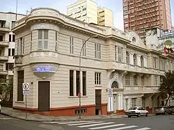 A inclinação da rua deu margem a uma criativa solução arquitetônica, com fachada assimétrica de interessante volumetria com aberturas diferenciadas, blocos em projeção e outros em recuo, sacadas e ornamentação de relevos. Originalmente possuía uma cúpula de bronze sobre o torreão de esquina. Há um adensamento na decoração da porção central do prédio, com a porta principal de bandeira com vitral, emoldurada por duas pilastras jônicas de cada lado e um belo frontispício em arco redondo, coroado por uma grande face humana sorridente em relevo.