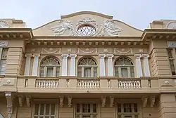 À direita, no piso superior, as aberturas dão para uma sacada com balaustrada e são em arco redondo também com vitrais geométricos nas bandeiras, sendo separadas por pilastras jônicas duplas e encimadas por um friso com festões e uma cornija. Acima deste bloco um grande frontão de perfil barroco mostra dois anjos em baixo-relevo segurando uma guirlanda floral que emoldura um óculo vazado com grade trabalhada, e sobre este uma pequena panóplia.