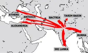 Lápides budistas do Período Ptolemaico foram encontrados em Alexandria, decoradas com representações do "Dharmacakra|Wheel of the Law".[2] Comentando sobre a presença de budistas em Alexandria, alguns estudiosos destacam que "Foi mais tarde nestes mesmos lugares que alguns dos centros mais ativos do Cristianismo foram estabelecidos "( Robert Linssen ).