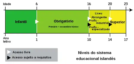 O sistema educacional islandês compreende quatro níveis: infantil, primário, secundário e superior.[9]