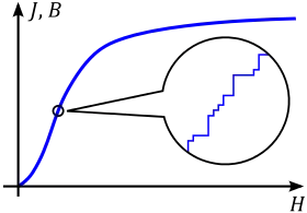 Magnetização (J) ou densidade de fluxo (B) da curvatura como função da intensidade do campo magnético (H) em um material ferromagnético. A inserção mostra saltos do efeito Barkhausen.