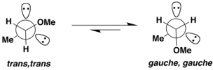 A hiperconjugação também é encontrada em moléculas acíclicas contendo heteroátomos, outra forma do efeito anomérico. Se uma molécula tem um átomo com um par solitário de elétrons e o átomo adjacente é capaz de aceitar elétrons no orbital σ *, ocorre hiperconjugação, estabilizando a molécula. Isso forma uma ressonância "sem vínculo". Para que essa sobreposição orbital ocorra, a conformação trans, trans é preferida para a maioria dos heteroátomos; no entanto, para que a estabilização ocorra no dimetoximetano, a conformação gauche, gauche é cerca de 3 a 5 kcal / mol mais baixa em energia (mais estável) do que a trans , conformação trans - é cerca de duas vezes maior que o efeito nos açúcares porque existem duas ligações rotativas (portanto, é trans em torno de ambas as ligações ou gauche em torno de ambas) que são afetadas.[7]